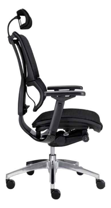Moderner, sehr bequemer Sessel der höheren Klasse mit atmungsaktiver, höhenverstellbarer Rückenlehne und flexibler Lordosenstütze. Die Rückenlehne ist mit einem schwarzen, atmungsaktiven Netz bespannt und mit einer verstellbaren 3D-Kopfstütze ausgestattet. Der Sitz ist in dieser Variante aus einem schwarzen, atmungsaktiven, selbsttragenden Netz gefertigt.