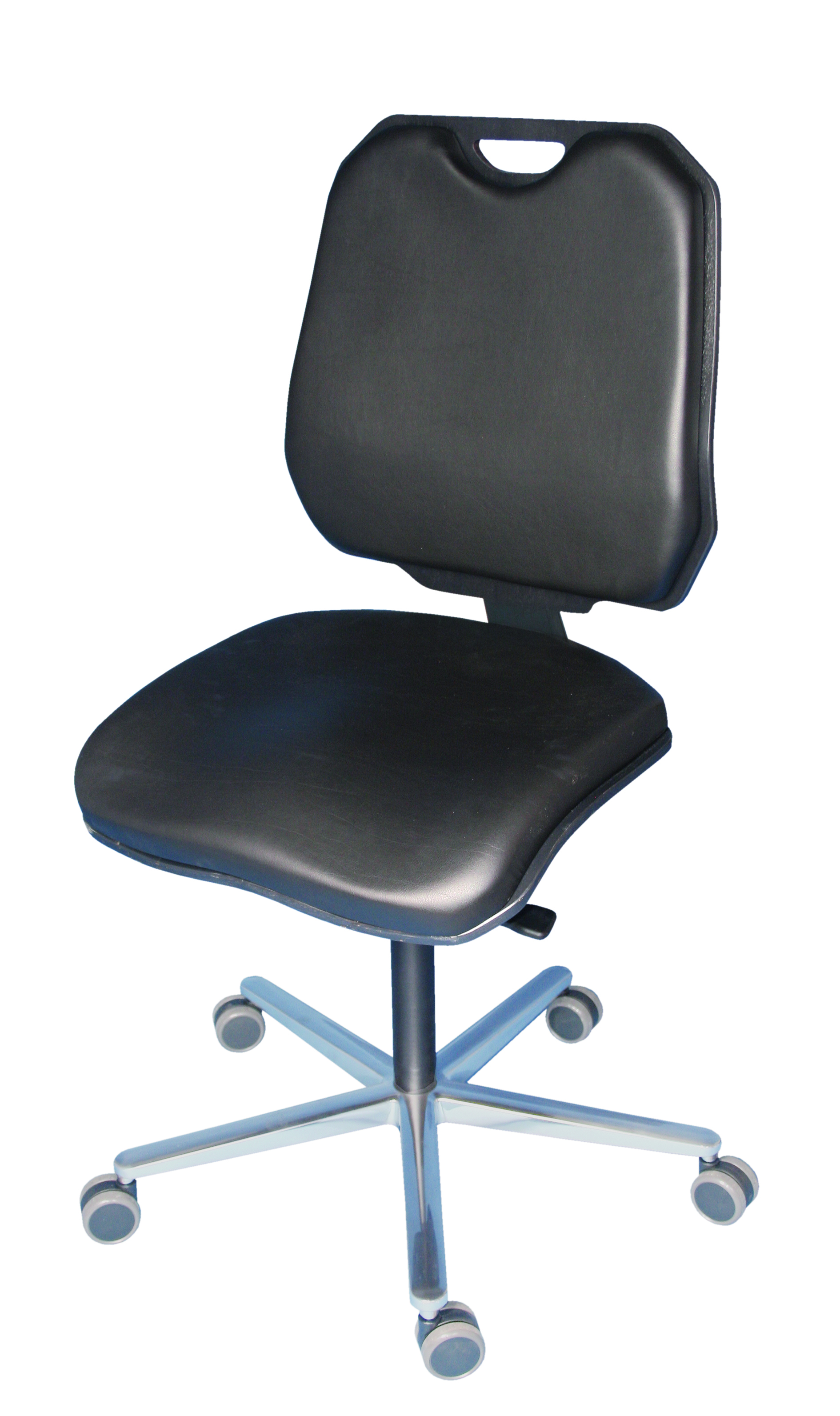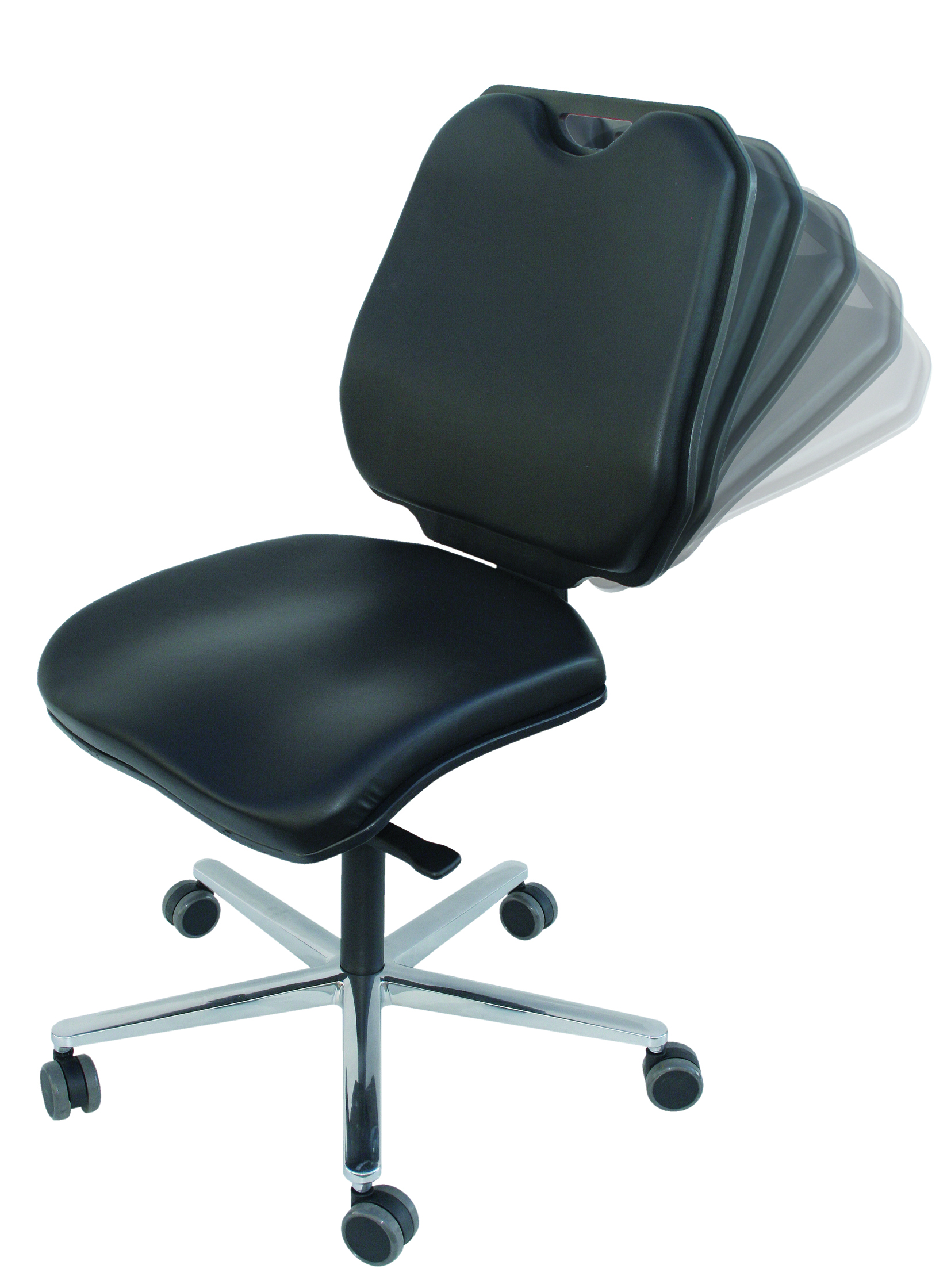 Arbeitsstuhl mit Synchronmechanik, verstärkter Feder und extra breitem Sitz (54 cm) sowie praktischer Griffmulde am Kopfende. Die Synchronmechanik ermöglicht eine stufenlose verstellbare Rückenneige und verstellbare Sitzneige und ist mit einem Handrad zur Gewichtseinstellung versehen. Stabile Ringarmlehnen können zusätzlich bestellt werden.