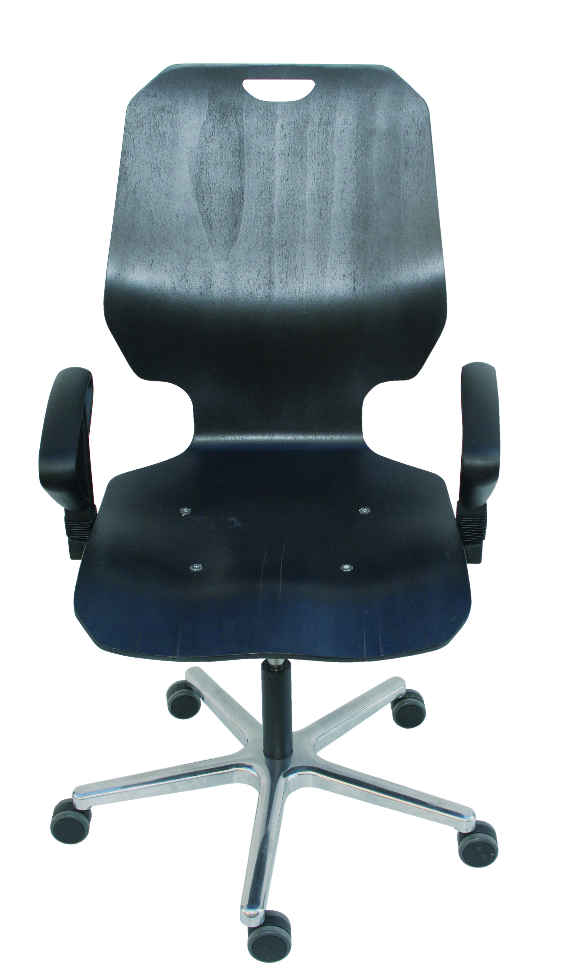 Der stabile Arbeitsstuhl aus schwarz gebeizten Buchenholz mit verstärkter Mechanik, einteiliger Sitzschale, Sicherheitsgasfeder und extra breitem Sitz (52 cm) kann auf Wunsch auch mit stabilen Ringarmlehnen und auswechselbaren Kunstlederauflagen (Aufpreis) für bequemeren Sitz ausgestattet werden.